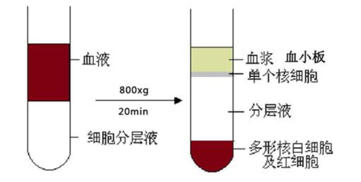 離心后將出現(xiàn)明顯的分層:最上層是稀釋的血漿層,中間是透明的分離液層,血漿與分離液之間的白膜層即為單個(gè)核細(xì)胞層,離心管底部是紅細(xì)胞與粒細(xì)胞。